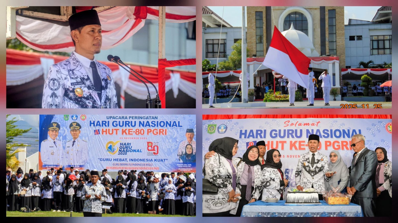 Semarak peringatan Hari Guru Nasional dan Hari Ulang Tahun (HUT) ke-80 Persatuan Guru Republik Indonesia (PGRI) Kabupaten Bima yang berlangsung di Lapangan Upacara Kantor Bupati Bima, Selasa (25/11/2025).