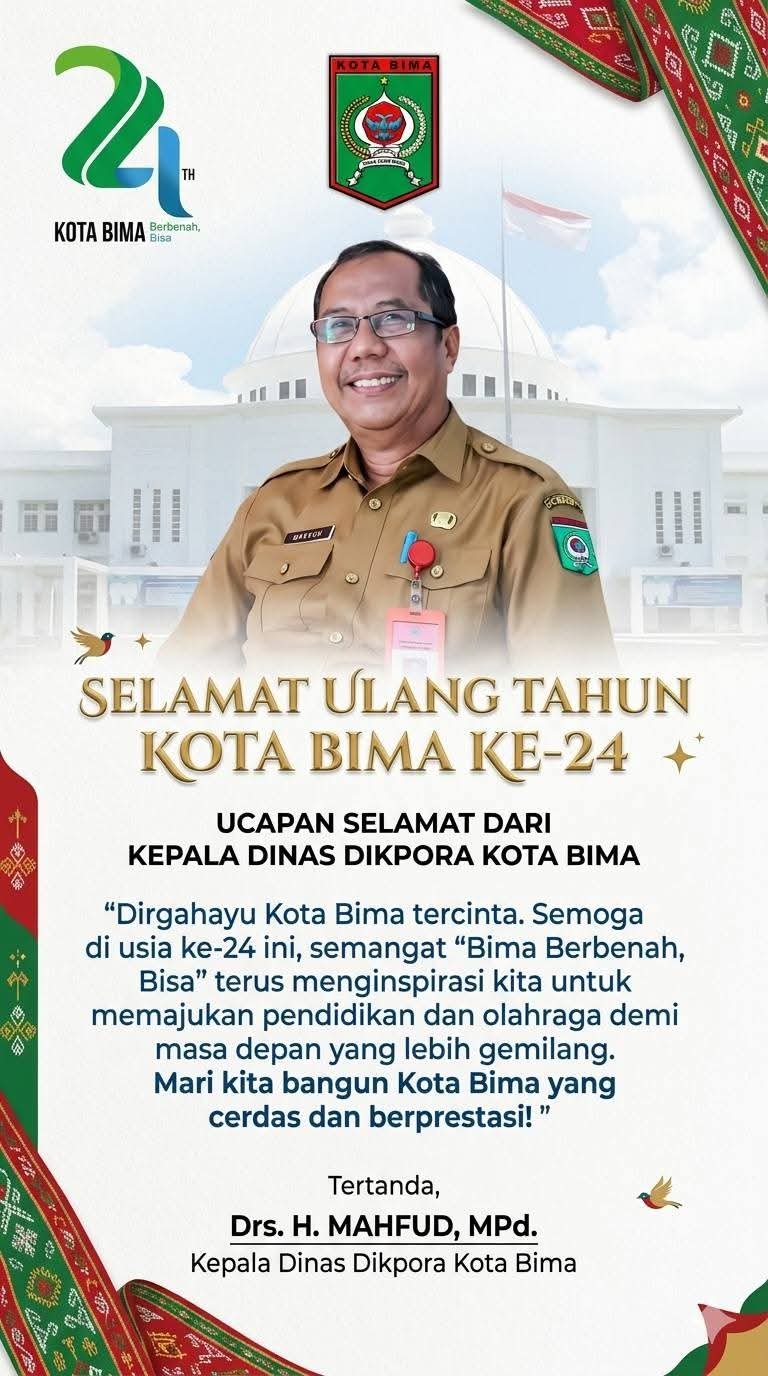Kepala Dinas Pendidikan, Pemuda, dan Olahraga (Dikpora) Kota Bima, Drs. H. Mahfud, M.Pd, Beserta Jajaran Mengucapkan Selamat HUT ke 24 Kota Bima 10 April 2026