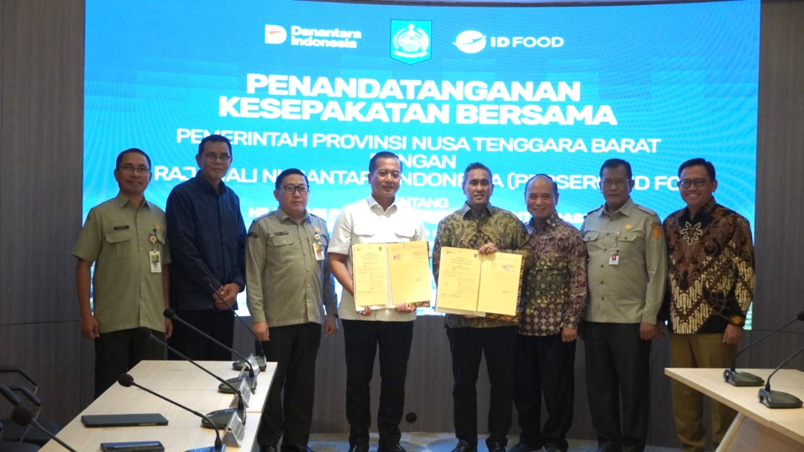 Penandatanganan MoU dilakukan oleh Gubernur NTB H. Lalu Muhamad Iqbal bersama Direktur Utama ID FOOD Ghimoyo, disaksikan oleh Dirjen Peternakan dan Kesehatan Hewan Kementerian Pertanian RI Dr. drh. Agung Suganda, M.Si, di Gedung PT Rajawali Nusantara Indonesia, kawasan Mega Kuningan, Jakarta, Senin (9/3/2026).