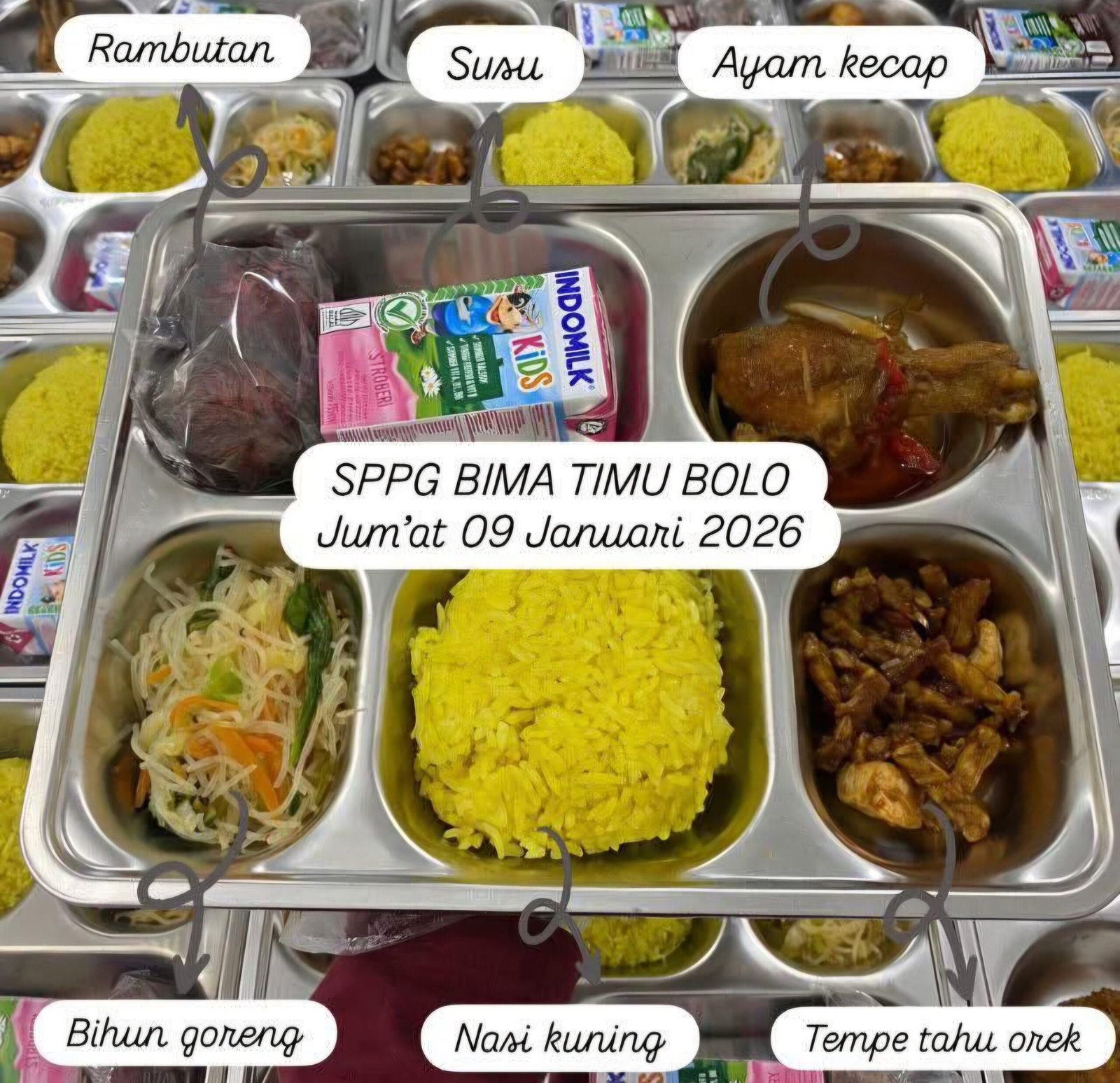 Gardaasakota.com.- Mulai beroperasi awal tahun 2026 ini, SPPG Bima yang berlokasi di Desa Timu Kecamatan Bolo Kabupaten Bima Bima hari ini, Jumat (9/1/2026), menyajikan menu spesial dan perdana untuk anak-anak pelajar, yaitu berupa nasi kuning dengan kombinasi lauk yang lezat dan bergizi seperti bihun goreng, tempe, tahu, ayam kecap, dilengkapi buah segar rambutan dan susu.