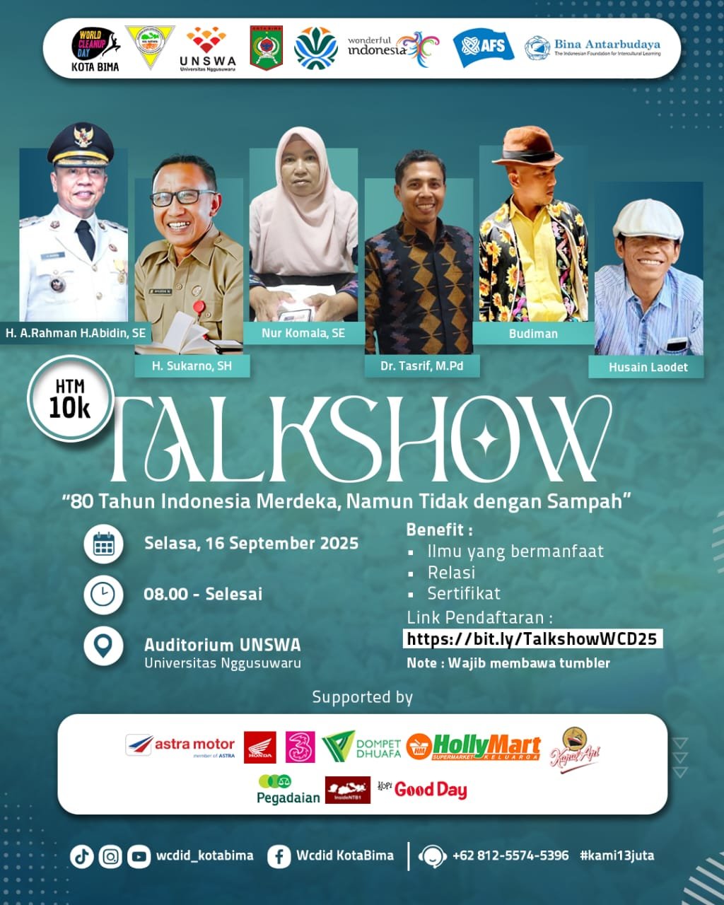 Gardaasakota.com.-Acara Talkshow World Cleanup Day 2025 di Kota Bima diprediksi bakal sangat menarik! Walikota Bima, H. A. Rahman H. Abidin, S.E, dan Kepala Dinas Pariwisata Kota Bima, H. Sukarno, S.H, akan menjadi pembicara bersama tokoh penting lainnya seperti Dr. Tasrif, M.Pd dari kalangan akademisi, Aktivis Lingkungan Budiman, Budayawan Husain Laodet, dan Nur Komala, S.E, Sekretaris DLH Kota Bima.