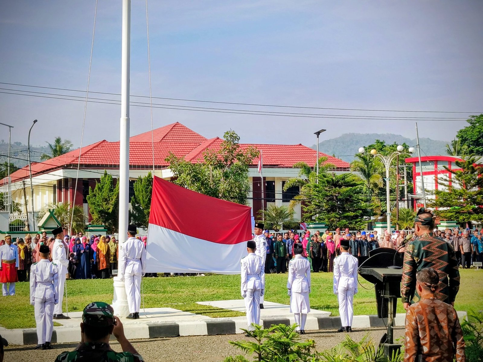 Upacara berlangsung tertib dan penuh semangat dengan A. Haris sebagai komandan upacara dan Drs. H. Mahfud, M.Pd sebagai perwira upacara.